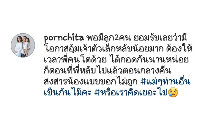 ซึ่งหลังจากที่ข้อความดังกล่าวของคุณแม่ลูกอ่อน เบนซ์ พรชิตา ถูกแชร์ออกไป ก็มีคุณแม่หลายท่านที่เข้ามาตอบคำถามและแบ่งปันประสบการณ์ที่คล้ายคลึงกันเป็นจำนวนหลายร้อยข้อความ อีกทั้งยังร่วมส่งกำลังให้กับเธอด้วยว่า ไม่อยากให้คิดมาก เพราะสุดท้ายแล้วทุกอย่างจะเข้าที่เข้าทางเป็นไปตามธรรมชาติเอง