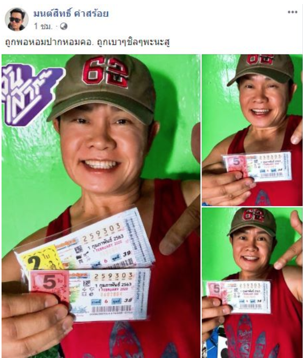 ถูกหวยบ่อย จนได้ฉายา เจ้าพ่อใบ้หวย ไปแล้ว สำหรับ มนต์สิทธิ์ ลูกทุ่งดัง โดยหลายงวดที่ผ่านมา มนต์สิทธิ์ คำสร้อย ก็ถูกลอตเตอรี่หลายรางวัล แล้วก็ถูกหวยงวดแรกของปีไปแล้ว ส่วนในงวด 1 ก.พ. ขอจัดอย่างต่อเนื่อง โดยลูกทุ่งดวงเฮง โพสต์เฟซบุ๊ก รับวันตรุษจีน ในชุดสีแดงรับทรัพย์ โชว์สลากกินแบ่งรัฐบาลในมือ เลขชุด 5 ใบ 30 ล้าน ได้แก่เลข 048695 , 202599 , 202543 , 912482 , 983338