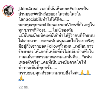 นักร้องสาวเสียงทรงพลัง “เจนนิเฟอร์ คิ้ม”ปกติก็โพสต์แต่รูปอาหาร รูปของกิน พอลงรูปตัวเองที โอ้โห สวยเลยจ้าพร้อมแคปชั่นว่า“เวลาที่ฉันเห็นยอด Follow เป็นล้านยอด ❤ เป็นร้อย ของใครต่อใครในโลก Social มันทำให้ได้คิด…… ขอบคุณทุกยอด Like และยอด View ที่ยังอยู่ในทุกๆภาพที่ Post……ใน IG ของฉัน แม้มันจะน้อยนิด แต่มันก็ทำให้รู้ว่าคนที่รักแบบไม่ฉาบฉวย…คอยสนับสนุนและใส่ใจเราจริงๆมีอยู่กี่% จากยอด Follow ทั้งหมด … เหมือนการร้องเพลงให้แขกที่เหลือที่ยังไม่กลับบ้านฟังในงานแม้จะกะหรอมกะแหรม แต่นั่นคือ…. “แฟนเพลงตัวจริง” …คนที่เป็นแรงบันดาลใจให้ทำงานเต็มที่ทุกครั้ง ….. กราบขอบคุณด้วยความซาบซึ้งใจค่ะ🙏🙏🙏”