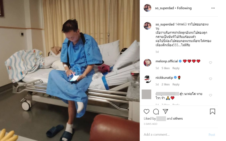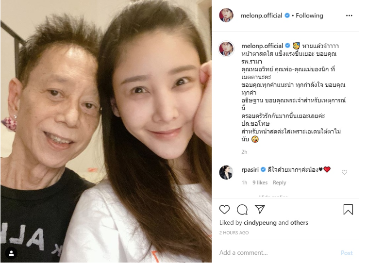 ล่าสุด แตงโม นิดา ก็ออกมาเผยภาพเซลฟี่คู่กับคุณพ่อโส ด้วยรอยยิ้มสดใส โชว์หน้าสด พร้อมเผยว่า คุณพ่อหายแล้ว ตอนนี้แข็งแรงขึ้นมาก”หายแล้วจ้าาาา หน้าตาสดใส แข็งแรงขึ้นเยอะ ขอบคุณ รพ.รามา คุณหมอวิทย์ คุณพ่อ-คุณแม่ของนิก ที่เมตตานะคะ ขอบคุณทุกคำแนะนำ ทุกกำลังใจ ขอบคุณทุกคำอธิษฐาน ขอบคุณพระเจ้าสำหรับเหตุการณ์นี้ ครอบครัวรักกันมากขึ้นเยอะเลยค่ะ”