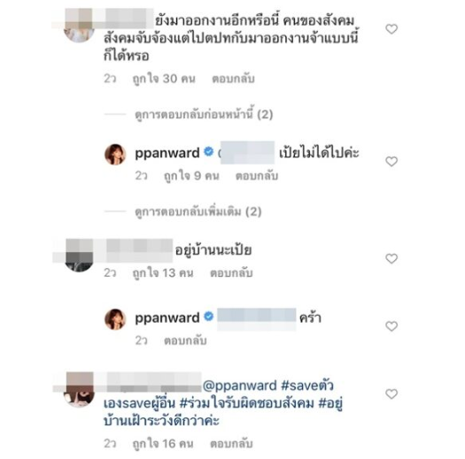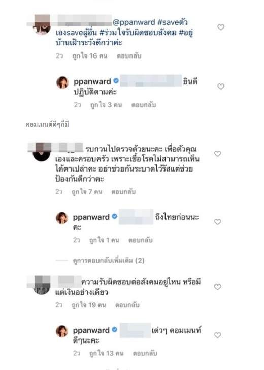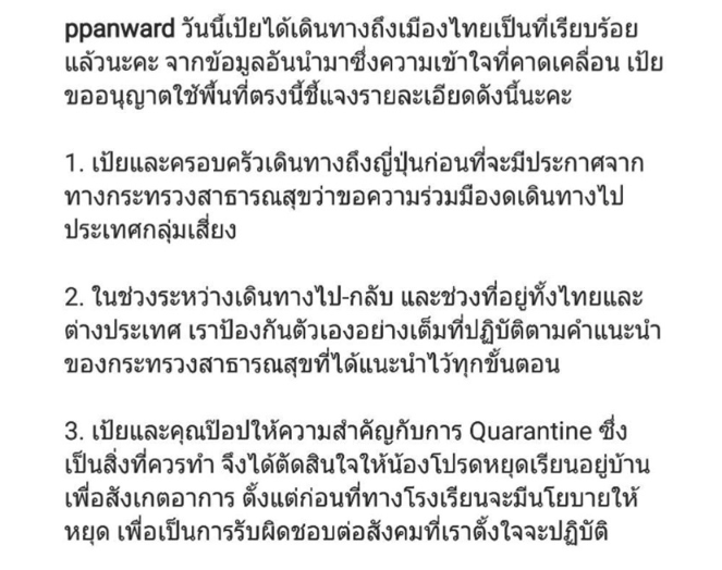 จนล่าสุด เป้ย ได้กลับมาถึงประเทศไทยแล้ว และได้โพสต์ อธิบายเรื่องราวต่างๆ ppanward วันนี้เป้ยได้เดินทางถึงเมืองไทยเป็นที่เรียบร้อยแล้วนะคะ จากข้อมูลอันนำมาซึ่งความเข้าใจที่คาดเคลื่อน เป้ยขออนุญาตใช้พื้นที่ตรงนี้ชี้แจงรายละเอียดดังนี้นะคะ 1. เป้ยและครอบครัวเดินทางถึงญี่ปุ่นก่อนที่จะมีประกาศจากทางกระทรวงสาธารณสุขว่าขอความร่วมมืองดเดินทางไปประเทศกลุ่มเสี่ยง 2. ในช่วงระหว่างเดินทางไป-กลับ และช่วงที่อยู่ทั้งไทยและต่างประเทศ เราป้องกันตัวเองอย่างเต็มที่ปฏิบัติตามคำแนะนำของกระทรวงสาธารณสุขที่ได้แนะนำไว้ทุกขั้นตอน 3. เป้ยและคุณป๊อปให้ความสำคัญกับการ Quarantine ซึ่งเป็นสิ่งที่ควรทำ จึงได้ตัดสินใจให้น้องโปรดหยุดเรียนอยู่บ้านเพื่อสังเกตอาการ ตั้งแต่ก่อนที่ทางโรงเรียนจะมีนโยบายให้หยุด เพื่อเป็นการรับผิดชอบต่อสังคมที่เราตั้งใจจะปฏิบัติ 4. ทางครอบครัวเป้ยดำเนินการตามมาตรการ Quarantine แยกตัวเองเป็นเวลา 14 วันนับตั้งแต่เดินทางถึงประเทศไทย และหลังจากนั้นจะไปตรวจเช็คหาเชื้อ Virus Covid 19 เพื่อเพิ่มความมั่นใจอีกครั้ง และเรื่องงานเป้ยได้เลื่อนงานที่มีอยู่ทั้งหมดออกไป