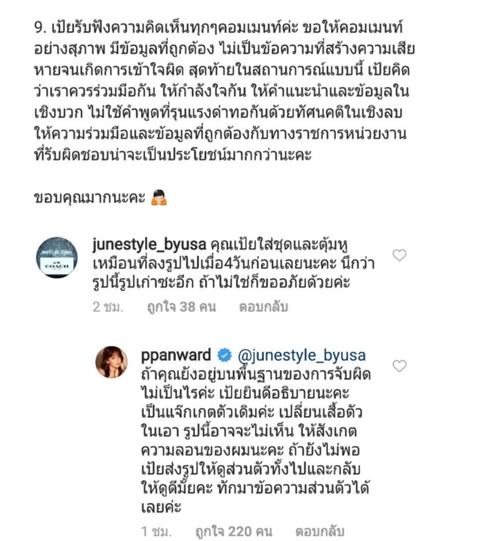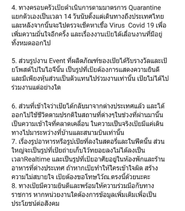 5. ส่วนรูปงาน Event ที่ผลิตภัณฑ์ของเป้ยได้รับรางวัลและเป้ยโพสต์ไปในไอจีนั้น เป็นรูปที่เป้ยต้องการแสดงความยินดี และมีเพียงหุ้นส่วนเป็นตัวแทนไปร่วมงานเท่านั้น เป้ยไม่ได้ไปร่วมงานแต่อย่างใด 6. ส่วนที่เข้าใจว่าเป้ยได้กลับมาจากต่างประเทศแล้ว และได้ออกไปใช้ชีวิตตามปรกติในสถานที่ต่างๆในช่วงที่ผ่านมานั้นเป็นความเข้าใจที่คลาดเคลื่อน ในความเป็นจริงเป้ยมีแค่เดินทางไปมาระหว่างที่บ้านและสนามบินเท่านั้น 7. เรื่องรูปอาหารหรือรูปเป้ยที่ลงในสตอรี่และในฟีดนั้น ส่วนใหญ่จะเป็นรูปที่เป้ยถ่ายเก็บไว้ทยอยลงไม่ได้ลงเป็นเวลาRealtime และเป็นรูปที่เป้ยอาศัยอยู่ในห้องพักและร้านอาหารที่ต่างประเทศ ถ้าหากเป้ยทำให้ใครเข้าใจผิด สร้างความไม่สบายใจ เป้ยต้องขอโทษไว้ณ.ตรงนี้ด้วยนะคะ 8. ทางเป้ยมีความยินดีและพร้อมให้ความร่วมมือกับทางราชการ หากหน่วยงานใดต้องการข้อมูลเพิ่มเติมเพื่อเป็นประโยชน์ต่อสังคม 9. เป้ยรับฟังความคิดเห็นทุกๆคอมเมนท์ค่ะ ขอให้คอมเมนท์อย่างสุภาพ มีข้อมูลที่ถูกต้อง ไม่เป็นข้อความที่สร้างความเสียหายจนเกิดการเข้าใจผิด สุดท้ายในสถานการณ์แบบนี้ เป้ยคิดว่าเราควรร่วมมือกัน ให้กำลังใจกัน ให้คำแนะนำและข้อมูลในเชิงบวก ไม่ใช้คำพูดที่รุนแรงด่าทอกันด้วยทัศนคติในเชิงลบ ให้ความร่วมมือและข้อมูลที่ถูกต้องกับทางราชการหน่วยงานที่รับผิดชอบน่าจะเป็นประโยชน์มากกว่านะคะ ขอบคุณมากนะคะ 🙏🏻