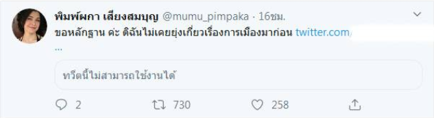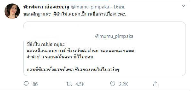 จากนั้นไม่นานก็มีคนเข้ามาวิจารณ์เรื่องนี้อย่างหลากหลาย ต่อมาแม่หมูก็ได้รีทวิตของผู้ใช้บัญชีรายหนึ่งมา พร้อมเขียนข้อความว่า “ขอหลักฐาน ค่ะ ดิฉันไม่เคยยุ่งเกี่ยวเรื่องการเมืองมาก่อน” ขณะเดียวกันพี่หมูก็ได้รีบข้อความที่มีการกล่าวถึงตนในทำนองเลือกฝั่งทางการเมืองฝั่งหนึ่ง ซึ่งแม่หมูก็ได้เขียนข้อความอธิบายว่า “ขอหลักฐานค่ะ ดิฉันไม่เคยตกเป็นเหยื่อการเมืองนะคะ”
