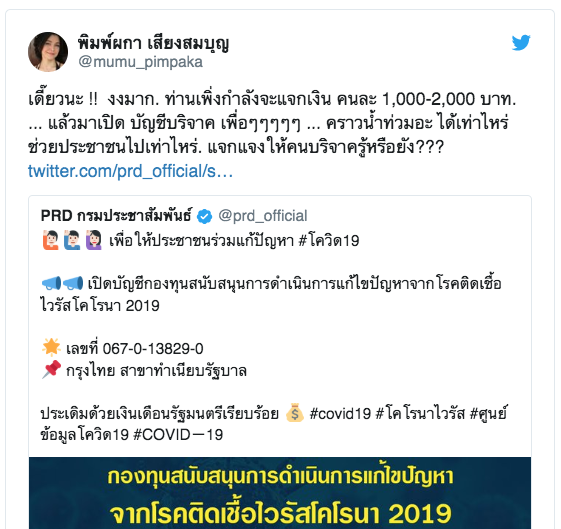 “เดี๊ยวนะ !! งงมาก. ท่านเพิ่งกำลังจะแจกเงิน คนละ 1,000-2,000 บาท. … แล้วมาเปิด บัญชีบริจาค เพื่อๆๆๆๆๆ … คราวน้ำท่วมอะ ได้เท่าไหร่ ช่วยประชาชนไปเท่าไหร่. แจกแจงให้คนบริจาครู้หรือยัง?”