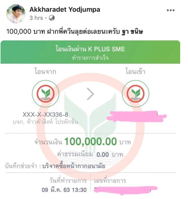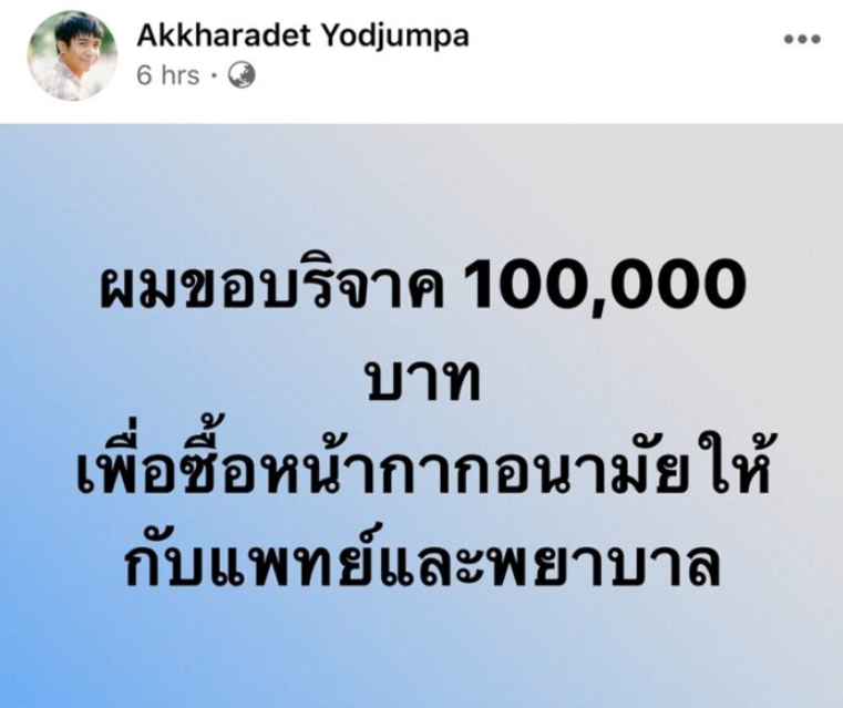 ล่าสุดหนุ่ม ก้อง ห้วยไร่ นักร้องลูกทุ่งชื่อดัง โดยล่าสุดเจ้าตัวได้โพสต์ข้อความผ่านเฟซบุ๊กส่วนตัว ระบุว่า “ผมขอบริจาค 100,000 บาท เพื่อซื้อหน้ากากอนามัยให้กับแพทย์และพยาบาล” จากนั้นตามมาด้วยสลิปการโอนเงิน พร้อมข้อความ “100,000 บาท ฝากพี่ควีนลุยต่อเลยนะครับ”