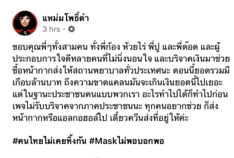 เพจแหม่มโพธิ์ดำ ได้โพสต์ข้อความด้วยว่า “ขอบคุณพี่ๆ ทั้งสามคน ทั้งพี่ก้อง ห้วยไร่ พี่ปู และพี่ต๊อด และผู้ประกอบการใจดีหลายคนที่ไม่นิ่งนอนใจ และบริจาคเงินมาช่วยซื้อหน้ากากส่งให้สถานพยาบาลทั่วประเทศนะ ตอนนี้ยอดรวมมีเกือบล้านบาทถึงความขาดแคลนมันจะเกินเงินยอดนี้ไปเยอะ แต่ในฐานะประชาชนคนแบบพวกเรา อะไรทำไปได้ก็ทำไปก่อน เพจไม่รับบริจาคจากภาคประชาชนนะ ทุกคนอยากช่วย ก็ส่งหน้ากากหรือแอลกอฮอล์ไป เดี๋ยวควีนส่งที่อยู่ให้ค่ะ #คนไทยไม่เคยทิ้งกัน #Maskไม่พอบอกพอ