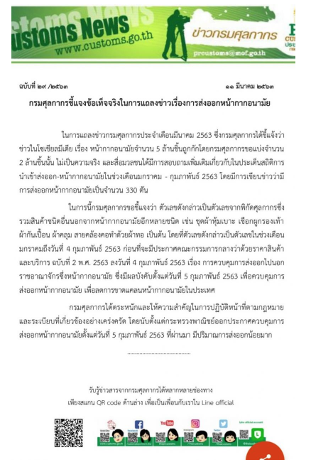 “ในการแถลงข่าวกรมศุลกากร ประจำเดือนมีนาคม 2563 ซึ่งกรมศุลกากรได้ชี้แจงว่า ข่าวในโซเชียลมีเดีย เรื่อง หน้ากากอนามัยจำนวน 5 ล้านชิ้นถูกกัก โดยกรมศุลกากรขอแบ่งจำนวน 2 ล้านชิ้นนั้น ไม่เป็นความจริง และสื่อมวลชนได้มีการสอบถามเพิ่มเติมเกี่ยวกับในประเด็นสถิติการนำเข้าส่งออก-หน้ากากอนามัยในช่วงเดือนมกราคม – กุมภาพันธ์ 2563 โดยมีการเขียนข่าวว่ามีการส่งออกหน้ากากอนามัยเป็นจำนวน 330 ตัน”ในการนี้กรมศุลกากร ขอชี้แจงว่า ตัวเลขดังกล่าวเป็นตัวเลขจากพิกัดศุลกากร ซึ่งรวมสินค้าชนิดอื่นนอกจากหน้ากากอนามัยอีกหลายชนิด เช่น ชุดผ้าหุ้มเบาะ เชือกผูกรองเท้า ผ้ากันเปื้อน ผ้าคลุม สายคล้องคอทำด้วยผ้าทอ เป็นต้น” เนื้อหาส่วนหนึ่งในเอกสาร