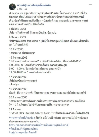 เนื่องจาก ผม สนุ๊ก บดินทร์ ฤกษ์วุฒิพงษ์ ได้ติดเชื้อ Covid-19 ต่อไปนี้เป็น timeline ที่ผมได้เดินทางไปในสถานที่ต่างๆ จึงขอเรียนแจ้งให้ทุกคนที่เกี่ยวข้องได้รับทราบเพื่อเป็นการป้องกันตัวเอง ครอบครัว และหยุดการแพร่กระจายของโรคต่อไป มีดังนี้ครับ6 มีนาคม 2563 :ไปงานวันเกิดรุ่นพี่ ที่ สถานบันเทิง. ชื่อ noiz 9 มีนาคม 2563 :ไปร้านหมูกะทะ รัชดาซอย 7 (ไม่มีชื่อร้านอยู่หน้าฟิตเนส เป็นแบบสั่งมาเป็นชุด-ไม่ใช่บุฟเฟ่ต์) 10 มีนา2563 : สนามบาส บีโปรบางนา 15 มีนาคม 2563 ไปทำงานถ่ายทำภาพยนตร์โทรทัศน์ “เสียงหัวใจ…ที่อยากให้ได้ยิน” 6.00-9.00 น. โลเคชั่นร้านขายเสื้อผ้า ตลาดสุวรรณภูมิ 9.00-11.00 น. โลเคชั่นร้านเสริมสวย ลาดกระบัง 12.00-18.00 น. โลเคชั่นบ้านประชาชื่น 17 มีนาคม 2563 :ไปห้างเซ็นทรัลพระราม 9 – ร้าน lyn 19 มีนาคม 2563 ช่วงค่ำ มีอาการปวดหัว จึงทานยาพาราเซตตามอล และใช้แผ่นเจลลดไข้ 20 มีนาคม 2563 ได้รับแจ้งทางโทรศัพท์จากเพื่อนที่ไปทานหมูกะทะด้วยกันว่า ติดเชื้อโควิท-19 จึงเดินทางไปเข้ารับการตรวจที่โรงพยาบาลจุฬาฯ 21 มีนาคม: เวลา 8.30 น. คุณหมอ จาก รพ.จุฬาฯ โทรศัพท์แจ้งผลว่าติดเชื้อโควิท-19 #หากท่านใดที่เกี่ยวข้อง สัมผัส หรือใกล้ชิดตัวผม อยากขอให้เฝ้าระวังและสังเกตุอาการของตนเองด้วย #กราบขออภัยด้วยจริงๆครับที่อาจเป็นต้นเหตุให้เสี่ยงได้ #ติดเชื้อแล้วต้องบอกสังคม #อยู่บ้านหยุดเชื้อเพื่อชาติ