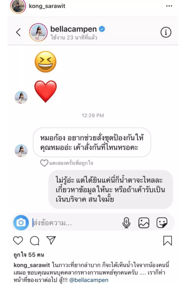 และงานนี้ก็มีน้ำใจดีๆ ของเพื่อนร่วมวงการ ที่ทำเอา หมอก้อง สรวิชญ์ ถึงกับซึ้งใจน้ำตาจะไหล เมื่อเพื่อนนักแสดง นางเอกสาว เบลล่า ราณี ทักไดเร็กแมสเสจมาหาเพื่อสอบถามเรื่องการซื้อชุดป้องกันให้คุณหมอใส่ ว่าหาซื้อได้ที่ไหนโดย หมอก้อง ได้เผยข้อความที่คุยกับสาว เบลล่า พร้อมแคปชั่นว่า “ในภาวะที่ยากลำบาก ก็จะได้เห็นน้ำใจจากน้องคนนี้เสมอ ขอบคุณแทนบุคลากรทางการแพทย์ทุกคนครับ เราก็ทำหน้าที่ของเราต่อไป สู้!!!”