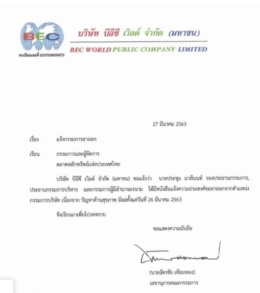 นายฉัตรชัย เทียมทอง เลขานุการคณะกรรมการ บริษัท บีอีซี เวิลด์ จำกัด (มหาชน)หรือ BEC แจ้งตลาดหลักทรัพย์แห่งประเทศไทย (ตลท.)ว่า นายประชุม มาลีนนท์ รองประธานกรรมการ ประธานกรรมการบริหาร และกรรมการผู้มีอำนาจลงนาม ได้มีหนังสือแจ้งความประสงค์ลาออกจากตำแหน่งกรรมการบริษัท เนื่องจากมีปัญหาด้านสุขภาพ มีผลตั้งแต่วันที่ 26 มี.ค.2563