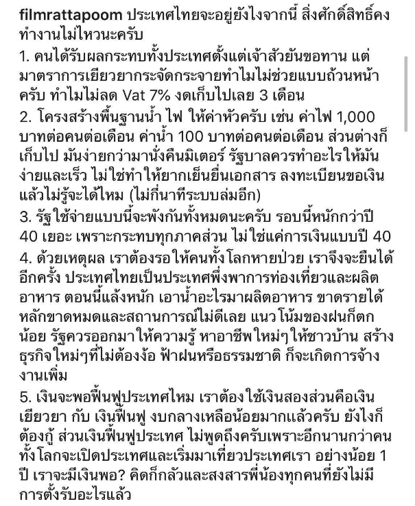 หนุ่ม ฟิล์ม รัฐภูมิ ออกมาโพสต์ไอจีส่วนตัวถึงการทำงานของรัฐบาล พร้อมกับตั้งคำถาม ระบุว่า… ประเทศไทยจะอยู่ยังไงจากนี้ สิ่งศักดิ์สิทธิ์คงทำงานไม่ไหวนะครับ 1. คนได้รับผลกระทบทั้งประเทศตั้งแต่เจ้าสัวยันขอทาน แต่มาตราการเยียวยากระจัดกระจายทำไมไม่ช่วยแบบถ้วนหน้าครับ ทำไมไม่ลด Vat 7% งดเก็บไปเลย 3 เดือน 2. โครงสร้างพื้นฐานน้ำ ไฟ ให้ค่าหัวครับ เช่น ค่าไฟ 1,000 บาทต่อคนต่อเดือน ค่าน้ำ 100 บาทต่อคนต่อเดือน ส่วนต่างก็เก็บไป มันง่ายกว่ามานั่งคืนมิเตอร์ รัฐบาลควรทำอะไรให้มันง่ายและเร็ว ไม่ใช่ทำให้ยากเย็นยื่นเอกสาร ลงทะเบียนขอเงินแล้วไม่รู้จะได้ไหม (ไม่กี่นาทีระบบล่มอีก) 3. รัฐใช้จ่ายแบบนี้จะพังกันทั้งหมดนะครับ รอบนี้หนักกว่าปี 40 เยอะ เพราะกระทบทุกภาคส่วน ไม่ใช่แค่การเงินแบบปี 40