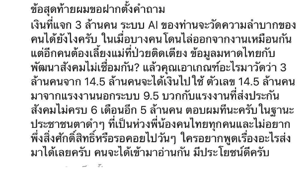 4. ด้วยเหตุผล เราต้องรอให้คนทั้งโลกหายป่วย เราจึงจะยืนได้อีกครั้ง ประเทศไทยเป็นประเทศพึ่งพาการท่องเที่ยวและผลิตอาหาร ตอนนี้แล้งหนัก เอาน้ำอะไรมาผลิตอาหาร ขาดรายได้หลักขาดหมดและสถานการณ์ไม่ดีเลย แนวโน้มของฝนก็ตกน้อย รัฐควรออกมาให้ความรู้ หาอาชีพใหม่ๆให้ชาวบ้าน สร้างธุรกิจใหม่ๆที่ไม่ต้องง้อ ฟ้าฝนหรือธรรมชาติ ก็จะเกิดการจ้างงานเพิ่ม 5. เงินจะพอฟื้นฟูประเทศไหม เราต้องใช้เงินสองส่วนคือเงินเยียวยา กับ เงินฟื้นฟู งบกลางเหลือน้อยมากเเล้วครับ ยังไงก็ต้องกู้ ส่วนเงินฟื้นฟูประเทศ ไม่พูดถึงครับเพราะอีกนานกว่าคนทั้งโลกจะเปิดประเทศและเริ่มมาเที่ยวประเทศเรา อย่างน้อย 1 ปี เราจะมีเงินพอ? คิดก็กลัวและสงสารพี่น้องทุกคนที่ยังไม่มีการตั้งรับอะไรแล้ว ข้อสุดท้ายผมขอฝากตั้งคำถาม เงินที่แจก 3 ล้านคน ระบบ AI ของท่านจะวัดความลำบากของคนได้ยังไงครับ ในเมื่อบางคนโดนไล่ออกจากงานเหมือนกันแต่อีกคนต้องเลี้ยงแม่ที่ป่วยติดเตียง ข้อมูลมหาดไทยกับพัฒนาสังคมไม่เชื่อมกัน? แล้วคุณเอาเกณฑ์อะไรมาวัดว่า 3 ล้านคนจาก 14.5 ล้านคนจะได้เงินไปใช้ ตัวเลข 14.5 ล้านคนมาจากแรงงานนอกระบบ 9.5 บวกกับแรงงานที่ส่งประกันสังคมไม่ครบ 6 เดือนอีก 5 ล้านคน ตอบผมทีนะครับในฐานะประชาชนตาดำๆ ที่เป็นห่วงพี่น้องคนไทยทุกคนและไม่อยากพึ่งสิ่งศักดิ์สิทธิ์หรือรอคอยไปวันๆ ใครอยากพูดเรื่องอะไรส่งมาได้เลยครับ คนจะได้เข้ามาอ่านกัน มีประโยชน์ดีครับ