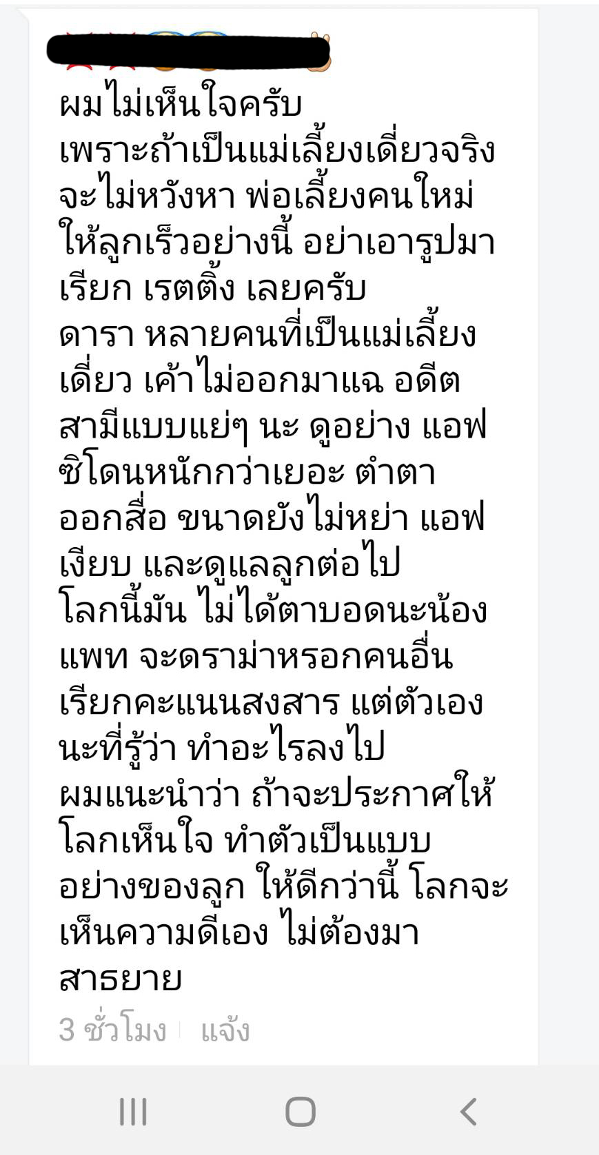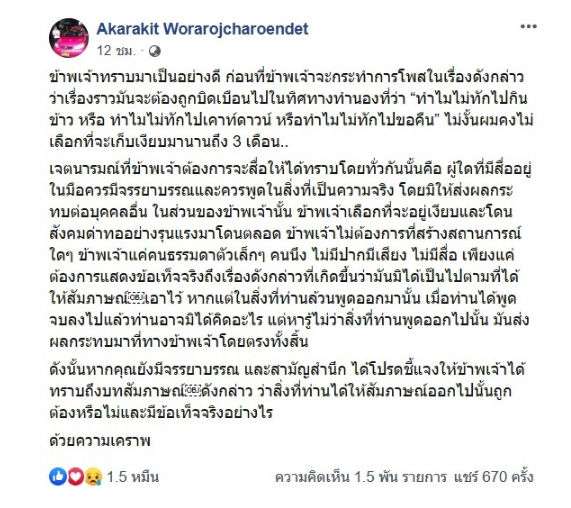 เบนซ์ เรซซิ่ง โพสต์ว่า ข้าพเจ้าทราบมาเป็นอย่างดี ก่อนที่ข้าพเจ้าจะกระทำการโพสในเรื่องดังกล่าว ว่าเรื่องราวมันจะต้องถูกบิดเบือนไปในทิศทางทำนองที่ว่า “ทำไมไม่ทักไปกินข้าว หรือ ทำไมไม่ทักไปเคาท์ดาวน์ หรือทำไมไม่ทักไปขอคืน” ไม่งั้นผมคงไม่เลือกที่จะเก็บเงียบมานานถึง 3 เดือน..เจตนารมณ์ที่ข้าพเจ้าต้องการจะสื่อให้ได้ทราบโดยทั่วกันนั้นคือ ผู้ใดที่มีสื่ออยู่ในมือควรมีจรรยาบรรณและควรพูดในสิ่งที่เป็นความจริง โดยมิให้ส่งผลกระทบต่อบุคคลอื่น ในส่วนของข้าพเจ้านั้น ข้าพเจ้าเลือกที่จะอยู่เงียบและโดนสังคมด่าทออย่างรุนแรงมาโดนตลอดข้าพเจ้าไม่ต้องการที่สร้างสถานการณ์ใดๆ ข้าพเจ้าแค่คนธรรมดาตัวเล็กๆ คนนึง ไม่มีปากมีเสียง ไม่มีสื่อ เพียงแค่ต้องการแสดงข้อเท็จจริงถึงเรื่องดังกล่าวที่เกิดขึ้นว่ามันมิได้เป็นไปตามที่ได้ให้สัมภาษณ์เอาไว้ หากแต่ในสิ่งที่ท่านล้วนพูดออกมานั้น เมื่อท่านได้พูดจบลงไปแล้วท่านอาจมิได้คิดอะไร แต่หารู้ไม่ว่าสิ่งที่ท่านพูดออกไปนั้น มันส่งผลกระทบมาที่ทางข้าพเจ้าโดยตรงทั้งสิ้น ดังนั้นหากคุณยังมีจรรยาบรรณ และสามัญสำนึก ได้โปรดชี้แจงให้ข้าพเจ้าได้ทราบถึงบทสัมภาษณ์ดังกล่าว ว่าสิ่งที่ท่านได้ให้สัมภาษณ์ออกไปนั้นถูกต้องหรือไม่และมีข้อเท็จจริงอย่างไร ด้วยความเคราพ