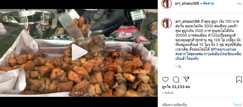“ถ้าคุณ ดูถูก เงิน 100 บาทต่อวัน คุณจะไม่เงิน 3000 ต่อเดือน และถ้าคุณ ดูถูกเงิน 1000 บาท คุณจะไม่ได้เงิน 30000 บาทต่อเดือน ทำไรไปเรื่อยสนุกดี ขอบคุณลูกค้าทุกท่าน หมู 128 โล เกลี้ยง นั่งหั่นหมูเองตั้งแต่ 10 โมง ถึง 2 ทุ่ม พรุ่งนี้ที่เดิม เวลาเดิม #อยากใส่ชุดเชฟมากๆแต่เมืองไทยร้อนเหลือเกินเข้าใจนะคับ”
