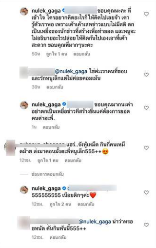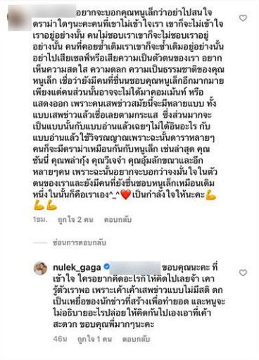 หนูเล็กก็ได้มาตอบกลับคอมเมนต์ดังกล่าวว่า “ขอบคุณนะคะ ที่เข้าใจ ใครอยากคิดอะไรก็ให้คิดไปเลยจ้า เรารู้ตัวเราพอ เพราะเค้าเค้าเสพข่าวแบบไม่มีสติ ตกเป็นเหยื่อของนักข่าวที่สร้างเพื่อทำยอด และหนูจะไม่อธิบายอะไรปล่อยให้คิดกันไปเองเอาที่เค้าสะดวก ขอบคุณพี่มากๆนะคะ” ต่อมาก็มีคนมาคอมเมนต์อีกว่า “ใช่ค่ะเราคนที่ชอบและรักหนูเล็กแต่ไม่ค่อยคอมเมนต์” ซึ่งสาวหนูเล็กก็ไม่พลาดเข้ามาตอบกลับว่า “ขอบคุณมากนะค่า อย่าตกเป็นเหยื่อข่าวที่สร้างขึ้นแค่ต้องการยอดคนด่าอะพี่.”.