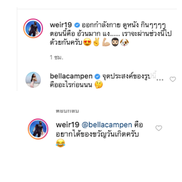 ล่าสุด เวียร์ ได้โพสต์รูปพร้อมแคปชั่นว่า”ออกกำลังกาย ดูหนัง กินๆๆๆๆ ตอนนี้คือ อ้วนมาก แง….. เราจะผ่านช่วงนี้ไปด้วยกันครับ” สาวเบลล่าก็ได้เข้ามาเมินต์ว่า”ประสงค์ของรูปนี้คืออะไรก่อนนน 🤔” หนุ่มเวียร์เข้ามาตอบโดยเร็วว่า”@bellacampen คือ อยากได้ของขวัญวันเกิดครับ😂 ” โอ๊ยๆเพื่อนๆเข้ามาเม้นต์กันถล่มทลายเลยจัา