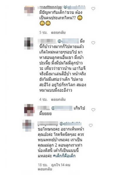 อุ้ม ลักขณา ก็เข้ามาคอมเมนต์ชี้แจงว่า เขาไม่ได้เอาแต่ใจนะคะ เขาแค่แสดงออกด้วยคำพูดไม่เป็น ยังพูดไม่ได้ การส่งเสียงดังของเขาคือการบอกของเด็ก เด็กเป็นไปตามวัย แม่คอยดูแลและสอนเขาอยู่ ไม่ต้องกังวลแทนนะคะ เด็กก็คือเด็ก จะมาพูดว่าเห็นอนาคตเป็นเด็กแบบไหนคุณรู้หรอคะ