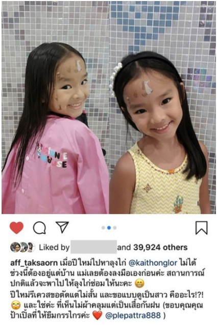 แม่ แอฟ ทักษอร ก็เลยต้องกลายเป็นช่างตัดผมจำเป็นให้ น้องปีใหม่ ลูกสาวสุดที่รัก แถมต้องตัดตามที่ลูกสาวรีเควสต์ซะด้วย ซึ่งเจ้าตัวได้โพสต์รูป พร้อมแคปชั่นลงไอจีว่า“เมื่อปีใหม่ไปหาลุงไก่ @kaithonglor ไม่ได้ ช่วงนี้ต้องอยู่แต่บ้าน แม่เลยต้องลงมือเองก่อนค่ะ สถานการณ์ปกติแล้วจะพาไปให้ลุงไก่ซ่อมให้นะคะ 😁 ปีใหม่รีเควสต์ขอตัดแต่ไม่สั้น และขอแบบดูเป็นสาว คืออะไร!?!🙄 และใช่ค่ะ ที่เห็นไม่ใช่ผ้าคลุมแต่เป็นเสื้อกันฝน (ขอบคุณคุณป้าเปิ้ลที่ให้ยืมกรรไกรค่ะ ❤️ @plepattra888 )”