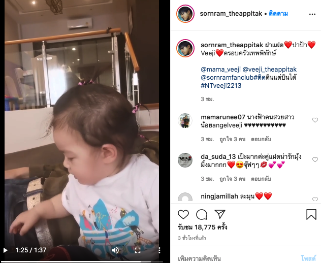 ล่าสุดในอินสตาแกรมของ หนุ่ม-ศรราม หลังมีข่าวเรื่องนี้ออกไป เจ้าตัวก็ได้มีการโพสต์คลิปเล่นกับลูกสาว น้องวีจิ ในอิริยาบถสุดน่ารัก พร้อมข้อความว่า “ฝาแฝด ปาป้า Veeji ครอบครัวเทพพิทักษ์ @mama_veeji @veeji_theappitak @sornramfanclub#ติดดินแต่บินได้#NTveeji2213”