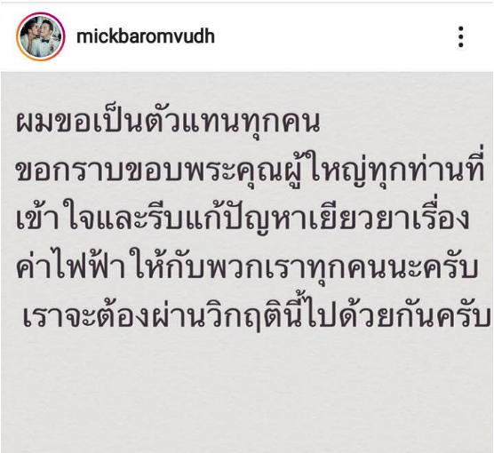 ล่าสุด หนุ่มมิค ก็ได้ออกมาเป็นตัวแทนของประชาชนที่มีปัญหาเรื่องค่าไฟแพงทุกคน ขอบคูณผู้ใหญ่ทุกท่าน ที่ช่วยรีบแก้ปัญหาและเยียวยาเรื่องค่าไฟให้ โดยงานนี้เจ้าตัวก็ได้เผยรูปภาพข้อความลงในอินสตาแกรมส่วนตัวบอกไว้ว่า…“ผมขอเป็นตัวแทนทุกคน ขอกราบขอบพระคุณผู้ใหญ่ทุกท่านที่เข้าใจและรีบแก้ปัญหา เยียวยาเรื่องค่าไฟฟ้า ให้กับพวกเราทุกคนนะครับ เราจะต้องผ่านวิกฤตนี้ไปด้วยกันนะครับ”