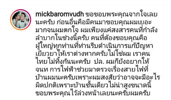 พร้อมกันนี้หนุ่มมิคก็ยังได้ระบุแคปชั่นเสริมไว้ด้วยว่า… “ขอขอบพระคุณจากใจเลยนะครับ ก่อนอื่นคือมีคนมาขอบคุณผมเยอะมากจนผมตกใจ ผมเพียงแค่สงสารคนที่กำลังลำบากในช่วงนี้ครับ คนที่ต้องขอบคุณคือผู้ใหญ่ทุกท่านที่ท่านรีบดำเนินการแก้ปัญหาเยียวยาให้เราต่างหากครับไม่ใช่ผม เราคนไทยไม่ทิ้งกันนะครับ
