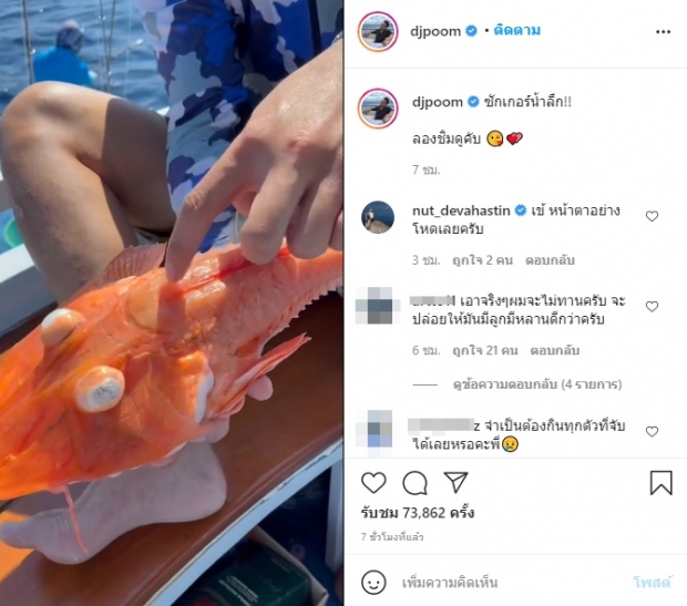อย่างล่าสุด เจ้าตัวโดนดราม่าอีกครั้ง หลังจากเผยคลิปขณะล่องเรือตกปลาทะเล ได้ปลาหลากหลายชนิด หนึ่งในนั้นคือ “ปลาซัคเกอร์” โดยเจ้าตัวได้โพสต์คลิปขณะจับขึ้นมาได้ จนกระทั่งนำปลาชนิดนี้มาทำอาหาร จัดใส่จาน ทานให้เห็นกันสดๆ พร้อมทั้งระบุข้อความว่า ….ซักเกอร์น้ำลึก!! ลองชิมดูคับ….