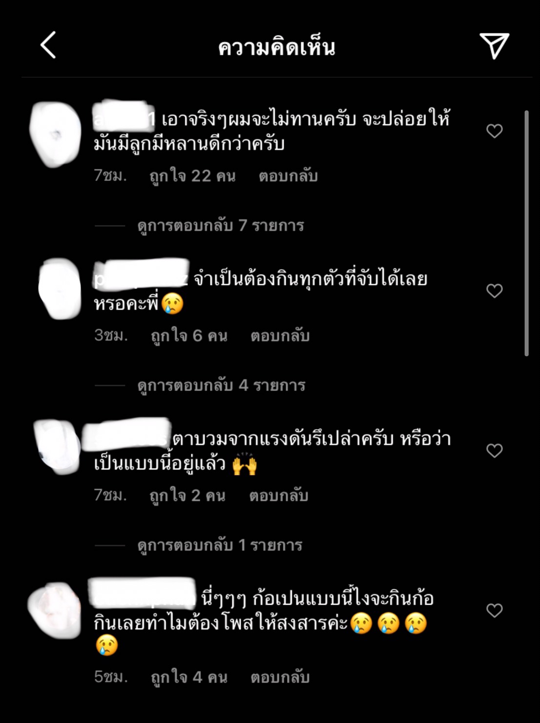 งานนี้ ทำเอาชาวเน็ตบางส่วนมองว่า “เอาจริงๆผมจะไม่ทานครับ จะปล่อยให้มันมีลูกมีหลานดีกว่าครับ” , “จำเป็นต้องกินทุกตัวที่จับได้เลยหรอคะพี่” และ “ตาบวมจากแรงดันรึเปล่าครับ หรือว่าเป็นแบบนี้อยู่แล้ว”