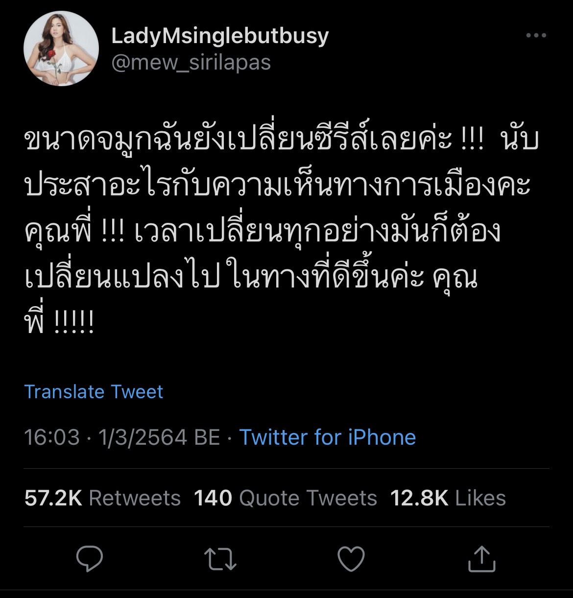 ล่าสุด หมิว ออกมาโพสต์ในTwitter ส่วนตัวว่า “ขนาดจมูกฉันยังเปลี่ยนซีรีส์เลยค่ะ !!! นับประสาอะไรกับความเห็นทางการเมืองคะคุณพี่ !!! เวลาเปลี่ยนทุกอย่างมันก็ต้องเปลี่ยนแปลงไปในทางที่ดีขึ้นค่ะ คุณพี่ !!!!!“ ซึ่งมีรีทวิตเป็นจำนวนมาก