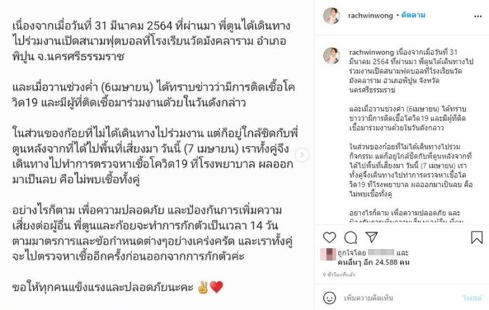 ด้าน “ก้อย รัชวิน” ก็โพสต์ข้อความและผลตรวจเช่นกัน มีข้อความว่า “เนื่องจากเมื่อวันที่ 31 มีนาคม 2564 ที่ผ่านมา พี่ตูนได้เดินทางไปร่วมงานเปิดสนามฟุตบอลที่โรงเรียนวัดมังคลาราม อำเภอพิปูน จังหวัด นครศรีธรรมราช และเมื่อวานช่วงค่ำ (6เมษายน) ได้ทราบข่าวว่ามีการติดเชื้อโควิด19 และมีผู้ที่ติดเชื้อมาร่วมงานด้วยในวันดังกล่าว ในส่วนของก้อยที่ไม่ได้เดินทางไปร่วมกิจกรรม แต่ก็อยู่ใกล้ชิดกับพี่ตูนหลังจากที่ได้ไปพื้นที่เสี่ยงมา วันนี้ (7 เมษายน) เราทั้งคู่จึงเดินทางไปทำการตรวจหาเชื้อโควิด19 ที่โรงพยาบาล ผลออกมาเป็นลบ คือไม่พบเชื้อทั้งคู่ อย่างไรก็ตาม เพื่อความปลอดภัย และป้องกันการเพิ่มความเสี่ยงต่อผู้อื่น พี่ตูนและก้อยจะทำการกักตัวเป็นเวลา 14 วัน ตามมาตรการและข้อกำหนดต่างๆอย่างเคร่งครัด และเราทั้งคู่จะไปตรวจหาเชื้ออีกครั้งก่อนออกจากการกักตัวค่ะ รอบนี้ใกล้ตัวมากจริงๆ ดูแลสุขภาพกายและใจกันดีๆน้าาา การ์ดอย่าตก อันนี้เรื่องจริงค่ะ ขอให้ทุกคนแข็งแรงและปลอดภัยนะคะ #14อีกครั้ง”