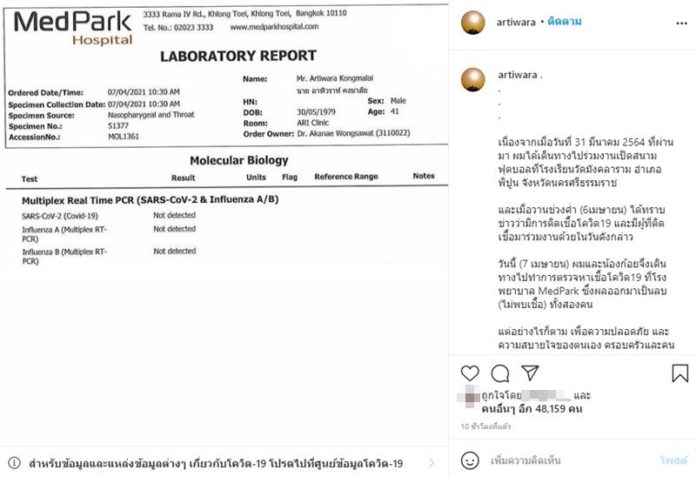 โควิด-19 กลับมาระบาดรอบ 3 นี้ น่ากลัวมาก ยอดผู้ติดตามพุ่งสูงขึ้นทุกๆวัน ทั้งคนในและคนนอกกวงการ ล่าสุด “ตูน บอดี้สแลม” หรือ “ตูน อาทิวราห์” โพสต์ผลตรวจโควิด-19 พร้อมข้อความว่า “เนื่องจากเมื่อวันที่ 31 มีนาคม 2564 ที่ผ่านมา ผมได้เดินทางไปร่วมงานเปิดสนามฟุตบอลที่โรงเรียนวัดมังคลาราม อำเภอพิปูน จังหวัดนครศรีธรรมราช และเมื่อวานช่วงค่ำ (6เมษายน) ได้ทราบข่าวว่ามีการติดเชื้อโควิด19 และมีผู้ที่ติดเชื้อมาร่วมงานด้วยในวันดังกล่าว วันนี้ (7 เมษายน) ผมและน้องก้อยจึงเดินทางไปทำการตรวจหาเชื้อโควิด19 ที่โรงพยาบาล MedPark ซึ่งผลออกมาเป็นลบ (ไม่พบเชื้อ) ทั้งสองคน แต่อย่างไรก็ตาม เพื่อความปลอดภัย และความสบายใจของตนเอง ครอบครัวและคนรอบข้าง ผมและก้อยจะทำการกักตัวเป็นเวลา 14 วัน ตามมาตรการและข้อกำหนดต่างๆ และเราทั้งคู่จะไปตรวจหาเชื้ออีกครั้งก่อนออกจากการกักตัว เพื่อความมั่นใจและเพื่อความปลอดภัยของทุกฝ่าย ขอให้ทุกคนแข็งแรงและปลอดภัยครับ”
