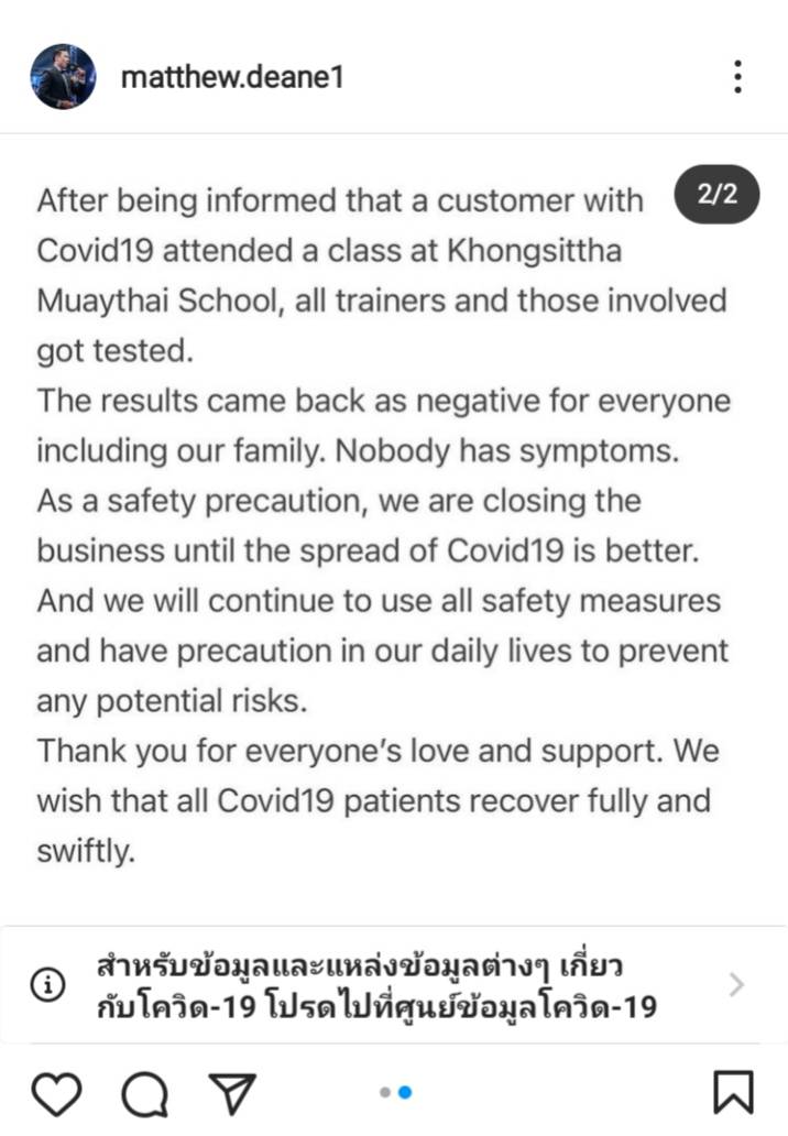 สืบเนื่องจากกรณีที่พิธีกรหนุ่ม แมทธิว ดีน ได้ออกมาแจ้งข่าวความเสี่ยง หลังได้ใกล้ชิดกับผู้ที่ติดเชื้อโควิด-19 ที่ค่ายมวยคงสิทธา เมื่อวันที่ 6 เมษายน ที่ผ่านมา และเริ่มเดินหน้ากักตัวตามมาตรการของรัฐ