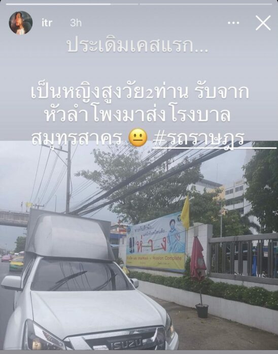 ส่งฟรีไม่มีค่าใช้จ่าย? “ไม่มีค่ะ ไม่ต้องให้อะไร ก็คือโทรบอกค่ะ แล้วเราก็จะไปรับให้ แต่ต้องเตรียมข้าวของอะไรที่ต้องใช้ คืออย่างที่บอกต้องมีปลายทางว่ารพ.รับแล้วแน่นอน ไม่ว่าจะเป็นรพ.ที่รักษาตัว หรือ รพ.สนามก็จะพาไปในจุดๆนั้น เพราะว่าตามจริงแล้วคนป่วยจะต้องเป็นคนแจ้งเอง แต่เราก็เห็นว่าหลายคนคุยไม่ไหวแล้ว ก็สามารถให้ญาติคุยแทนได้ค่ะ แค่มีจุดหมายปลายทางที่ชัดเจนแค่นั้นเอง”