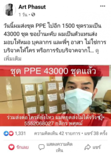 ขณะเดียวกันหนุ่มอาร์ต พศุตม์ บานแย้ม นักแสดงชายชื่อดัง ร่วมกับเพื่อนๆ ดารา และกลุ่มจิตอาสากู้ภัย สมทบทุนสนับสนุนซื้อชุด PPE ล่าสุดกว่า 44,000 ชุด มอบให้กับบุคลากรทางการแพทย์ ทั่วประเทศ