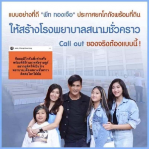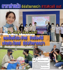 ทั้งนี้ ยังมีศิลปินดารานักแสดงนักร้องอีกหลายคนที่ออกมาทำความดี ช่วยประชาชนและส่งมอบอุปกรณ์การแพทย์ให้กับบุคลากร แทนการ Call Out การเมือง แต่ไม่ค่อยปรากฏเป็นข่าวนัก