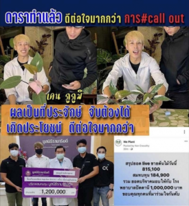 ไม่เพียงเท่านั้น หนุ่ม เคน ภูภูมิ นักแสดงหนุ่มชื่อดัง ก็ออกมาไลฟ์สดปลูกต้นไม้ สมทบทุนมอบเงินช่วยเหลือโรงพยาบาล และคู่รักดารานักร้องบอย พีชเมกเกอร์ กับภรรยาสาว เจี๊ยบ พิจิตตรา
