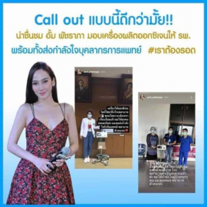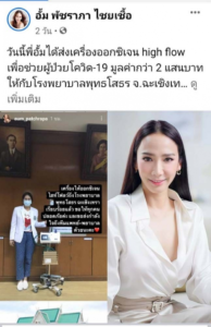 ด้าน อั้ม พัชราภา ไชยเชื้อ มอบเครื่องผลิตออกซิเจนให้โรงพยาบาลพร้อมส่งกำลังใจให้บุคลากรการแพทย์