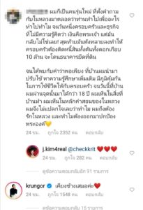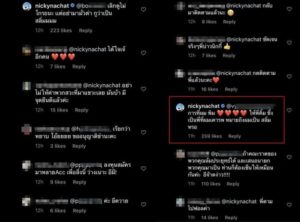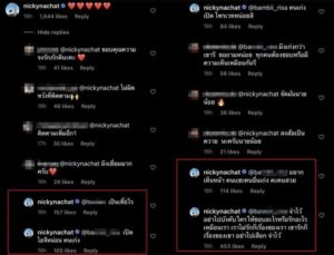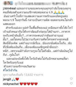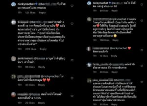 โดยมีคนบันเทิงร่วมส่งหัวใจคอมเมนต์กันรัวๆ รวมทั้ง นิกกี้ – ณฉัตร ก็เข้ามาคอมเมนต์ส่งหัวใจให้แม่คิ้มรัวๆ ก่อนจะดราม่าคอมเมนต์แซะบ้างว่าบ้าง ทั้งยังประกาศจะเลิกติดตามเลิกดู พร้อมต่อว่าหนุ่มนิกกี้เป็นสลิ่ม ทั้งยังถามไปถึง ก้อย – อรัชพร ว่าไงด้วย ขณะที่หนุ่มนิกกี้ก็คอมเมนต์ตอบกลับฟาดเดือดรัวๆ เช่นกัน