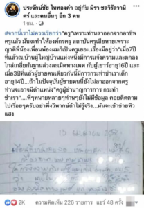 และเมื่อ 3 ปีที่แล้ว ผู้ชายคนเดียวกันนี้ มีการกระทำชำเราเด็กอายุ14ปี ถ้าในปัจจุบันผู้ชายคนนี้ยังไม่ลาออกจากครู ท่านจะอาจมีตำแหน่ง “ครูผู้ชำนาญการการ กระทำชำเรา “พี่ๆ ทนายหลายๆ ท่านๆ ยังไม่มีข้อมูล คอยติดตามไปเรื่อยๆ ครับ อย่าเพิ่งวิพากษ์ ถ้าไม่รู้จริง…มันจะเข้าข่ายหิวแสง”ท่ามกลางความคิดเห็นจากชาวเน็ตที่เข้ามาวิจารณ์ถึงประเด็นดราม่าดังกล่าวว่า “ครูผู้ชำนาญการกระทำชำเรา ‘รางวัลถ้วยตรา…ต้องเข้าแล้ว!” , “ตาลุก” , “รอติดตาม จัดให้หนักๆนะครับนายห้าง” , จัดค่ะจัด เอาให้จมคนแบบนี้” , “จัดให้หนักเลยค่ะนายห้าง”