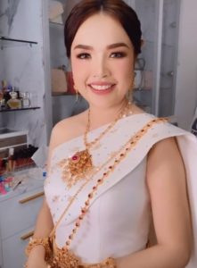 ในพิธีช่วงเช้า “เจนนี่” สวมชุดไทยสีครีมทอง จากแบรนด์ MONIQUE WEDDING และทำผม โดย khunyong_hair เป็นลุคแรกที่สวยสมการรอคอยมาก