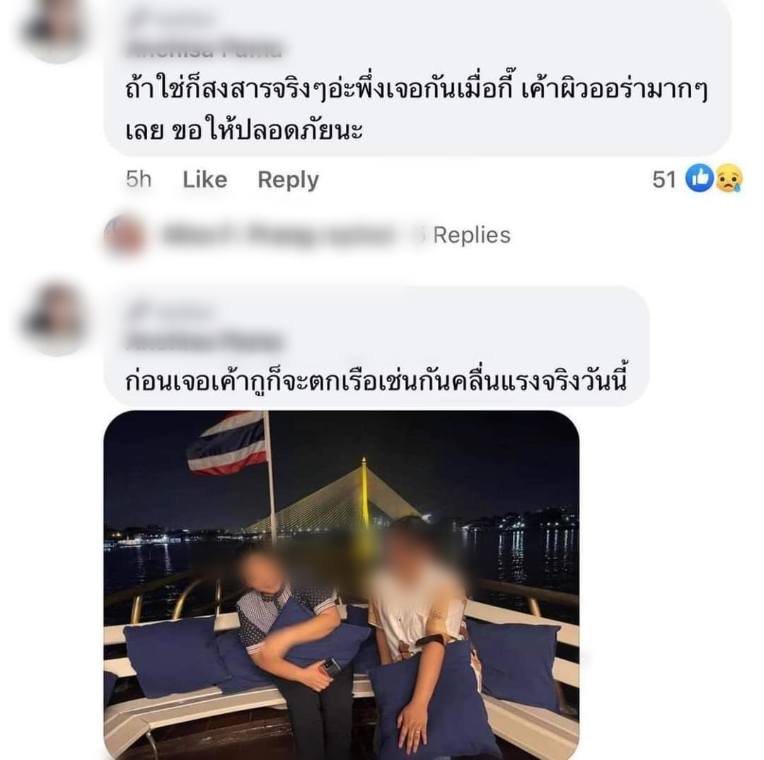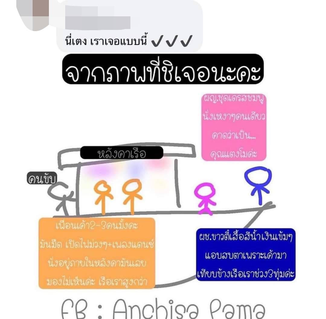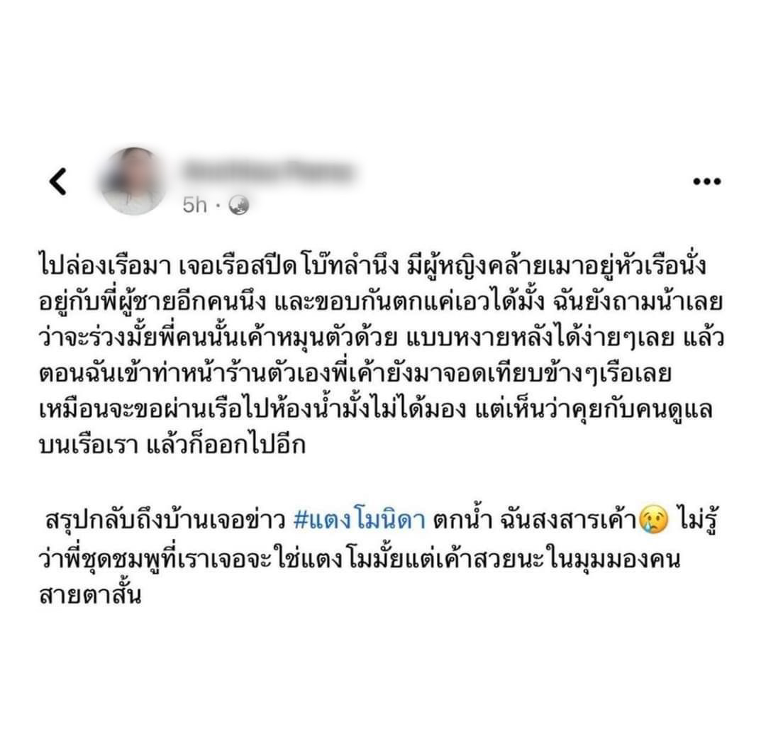 มีผู้หญิงคล้ายเมาอยู่หัวเรือนั่งอยู่กับพี่ผู้ชายอีกคนนึง และขอบกันตกแค่เอวได้มั้ง ฉันยังถามน้าเลยว่าจะร่วงมั้ยพี่คนนั้นเค้าหมุนตัวด้วย แบบหงายหลังได้ง่ายๆเลย แล้วตอนฉันเข้าท่าหน้าร้านตัวเองพี่เค้ายังมาจอดเทียบข้างๆเรือเลยเหมือนจะขอผ่านเรือไปห้องน้ำมั้งไม่ได้มอง แต่เห็นว่าคุยกับคนดูแลบนเรือเรา แล้วก็ออกไปอีก สรุปกลับถึงบ้านเจอข่าว #แตงโมนิดา ตกน้ำ ฉันสงสารเค้าไม่รู้ว่าพี่ชุดชมพูที่เราเจอจะใช่แตงโมมั้ยแต่เค้าสวยนะในมุมมอง คนสายตาสั้น ถ้ำใช่ก็สงสารจริงๆอ่ะพึ่งเจอกันเมื่อกี๊ เค้าผิวออร่า มากๆเลย ขอให้ปลอดภัยนะ“