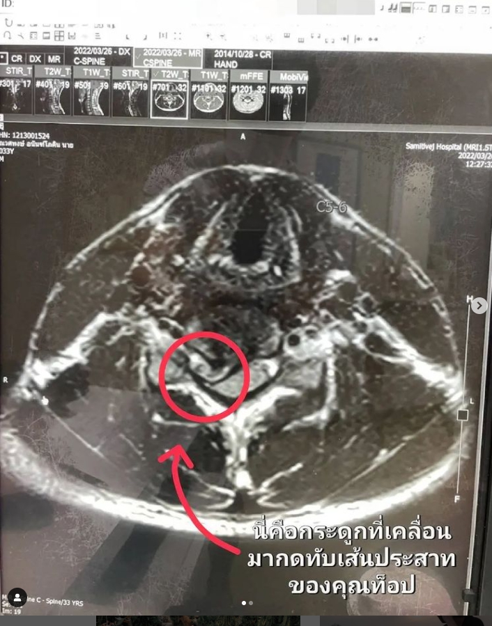มีหลายท่านเป็นห่วงและสอบถามเข้ามา ผมขอแจ้งอาการคุณท็อปเบื้องต้นนะครับ สืบเนื่องจาก วันก่อน คุณท็อปมีอาการปวดร้าวที่บริเวญต้นคอเฉียบพลัน มือและนิ้วชา ด้านขวา อ่อนแรง ไม่สามารถขยับได้ปกติ จึงรีบไปพบแพทย์ เพื่อทำการ MRI และเมื่อเช้าวันนี้ผล MRIออก ทางแพทย์วินิจฉัยว่า