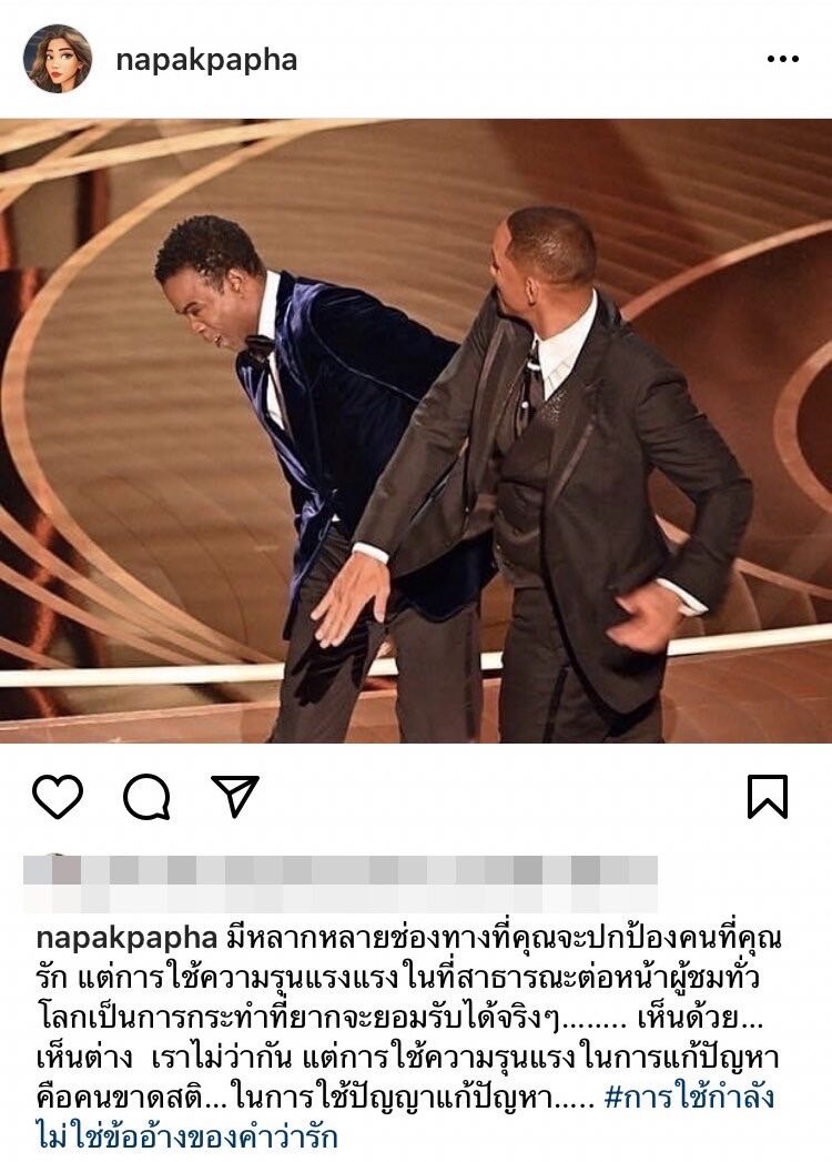 เอาสิ! เพราะว่าล่าสุด นักแสดงสาว มะหมี่ นภคปภา นาคประสิทธิ์ ออกมาแสดงความคิดเห็นถึงเรื่องนี้ เผยว่า มีหลากหลายช่องทางที่คุณจะปกป้องคนที่คุณรัก แต่การใช้ความรุนแรงแรงในที่สาธารณะต่อหน้าผู้ชมทั่วโลกเป็นการกระทำที่ยากจะยอมรับได้จริงๆ……..