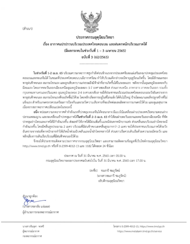 นางสาวชมภารี ชมภูรัตน์ อธิบดีกรมอุตุนิยมวิทยา ออกประกาศกรมอุตุนิยมวิทยาฉบับที่ 3 ลงวันที่ 30 มีนาคม 2565 เวลา 05.00 น. เรื่อง อากาศแปรปรวนบริเวณประเทศไทยตอนบน และฝนตกหนักบริเวณภาคใต้ (มีผลกระทบในช่วงวันที่ 1 – 3 เมษายน 2565)