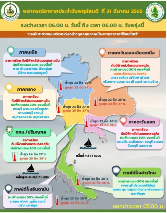 ประกาศ ณ วันที่ 31 มีนาคม พ.ศ. 2565 เวลา 05.00 น. กรมอุตุนิยมวิทยาจะออกประกาศฉบับต่อไปใน วันที่ 31 มีนาคม พ.ศ. 2565 เวลา 17.00 น.