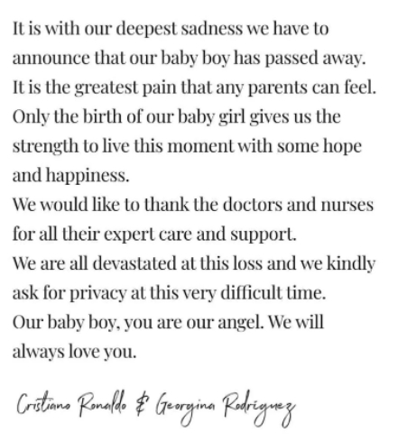 โรนัลโด้ แจ้งข่าวผ่าน อินสตาแกรม ว่า “เราเสียใจอย่างสุดซึ้งที่จะประกาศให้ทราบว่าลูกชายของเราเสียชีวิต มันเป็นความเจ็บปวดอันยิ่งใหญ่ที่ทุกครอบครัวรับรู้ได้ มีเพียงการกำเนิดของลูกสาวตัวน้อยอีกคนเท่านั้นที่ช่วยให้เรามีพลังชีวิตดำเนินต่อไปได้ด้วยความหวังและความสุข”
