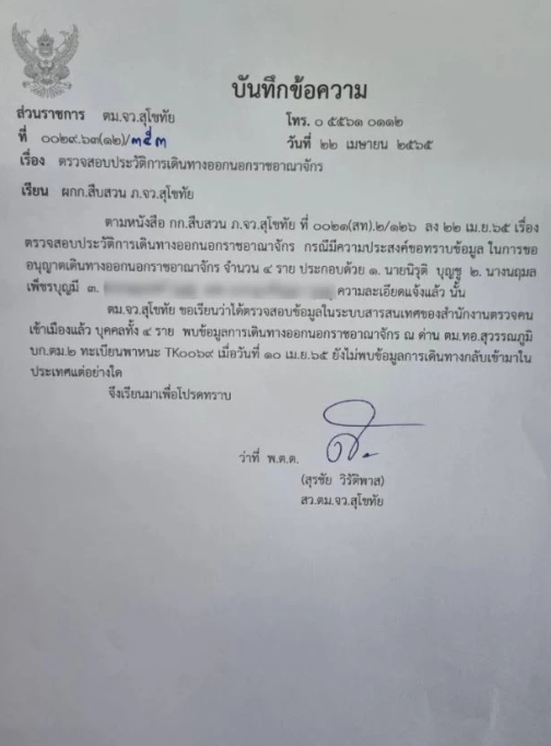 อัพเดตความคืบหน้า  ตม.สุโขทัย มีหนังสือบันทึกข้อความ เรื่องตรวจสอบประวัติการเดินทางออกนอกราชอาณาจักร โดยพบข้อมูลออกนอกราชอาณาจักร ณ ด่าน ตม.ทอ.สุวรรณภูมิ บก.ตม.2 ทะเบียนพาหนะ เที่ยวบิน TK0069 เมื่อวันที่ 10 เม.ย.2565 ปลายทางไป​ อิสตันบลู ประเทศ​ตุรกี ยังไม่พบข้อมูลกลับมาในประเทศแต่อย่างใด