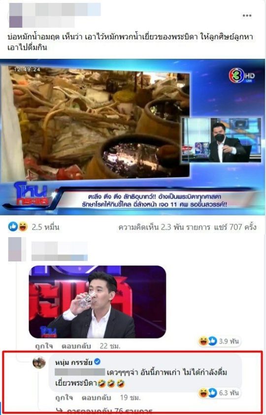 ล่าสุดมีเพจหนึ่งนำภาพของผู้ประกาศชื่อดัง “หนุ่ม กรรชัย” ดื่มน้ำอะไรบางอย่างในรายการโหนกระแส มาคอมเมนต์ใต้โพสต์ที่เขียนเรื่องเกี่ยวกับบ่อหมักน้ำอมฤต ที่เอาไว้หมักพวกน้ำเยี่ยวของพระบิดาเพื่อให้ลูกศิษย์ลูกหาเอาไปดื่ม ทำเอาชาวโชเซี่ยลตกใจกันใหญ่ว่าพี่หนุ่มดื่มเยี่ยวของพระบิดาหรือเปล่า
