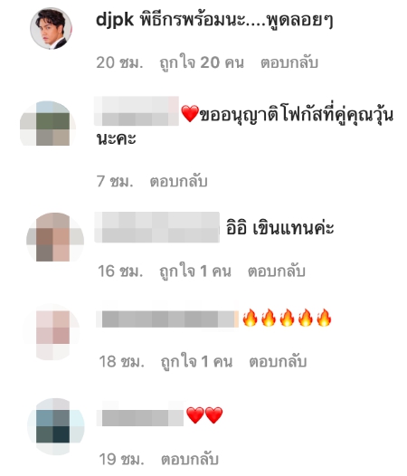งานนี้ พีเค ก็ได้เข้ามาคอมเมนต์แซวว่า ‘พิธีกรพร้อมนะ….พูดลอยๆ’ นอกจากนี้มีแฟนเข้ามาบอกว่า ‘ขออนุญาติโฟกัสที่คู่คุณวุ้นนะคะ’ และ ‘อิอิ เขินแทนค่ะ’
