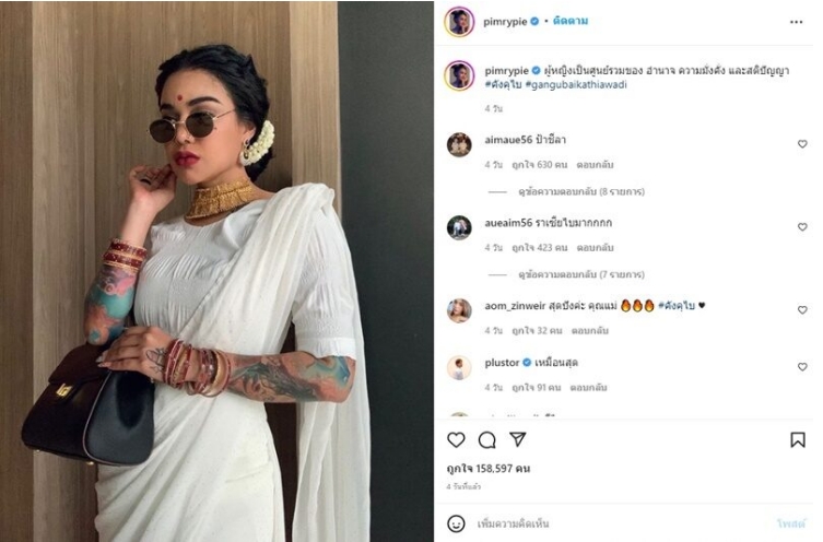 ล่าสุด สาวพิมรี่พาย โพสต์ภาพตัวเองคัฟเวอร์สวมบทเป็นคังคุไบเมืองไทย สวยเข้าตา เหมือนขั้นสุด จนนางเอก คังคุไบ ตัวจริง อย่าง อาเลีย บาตต์ นางเอกดังที่มีผู้ติดตามในไอจีส่วนตัวถึง 65.3 ล้านฟอลโลเวอร์ ถึงกับแชร์ไอจีสตอรี่ พิมรี่พาย พร้อมข้อความภาษาอังกฤษบอกว่า Love ด้วย