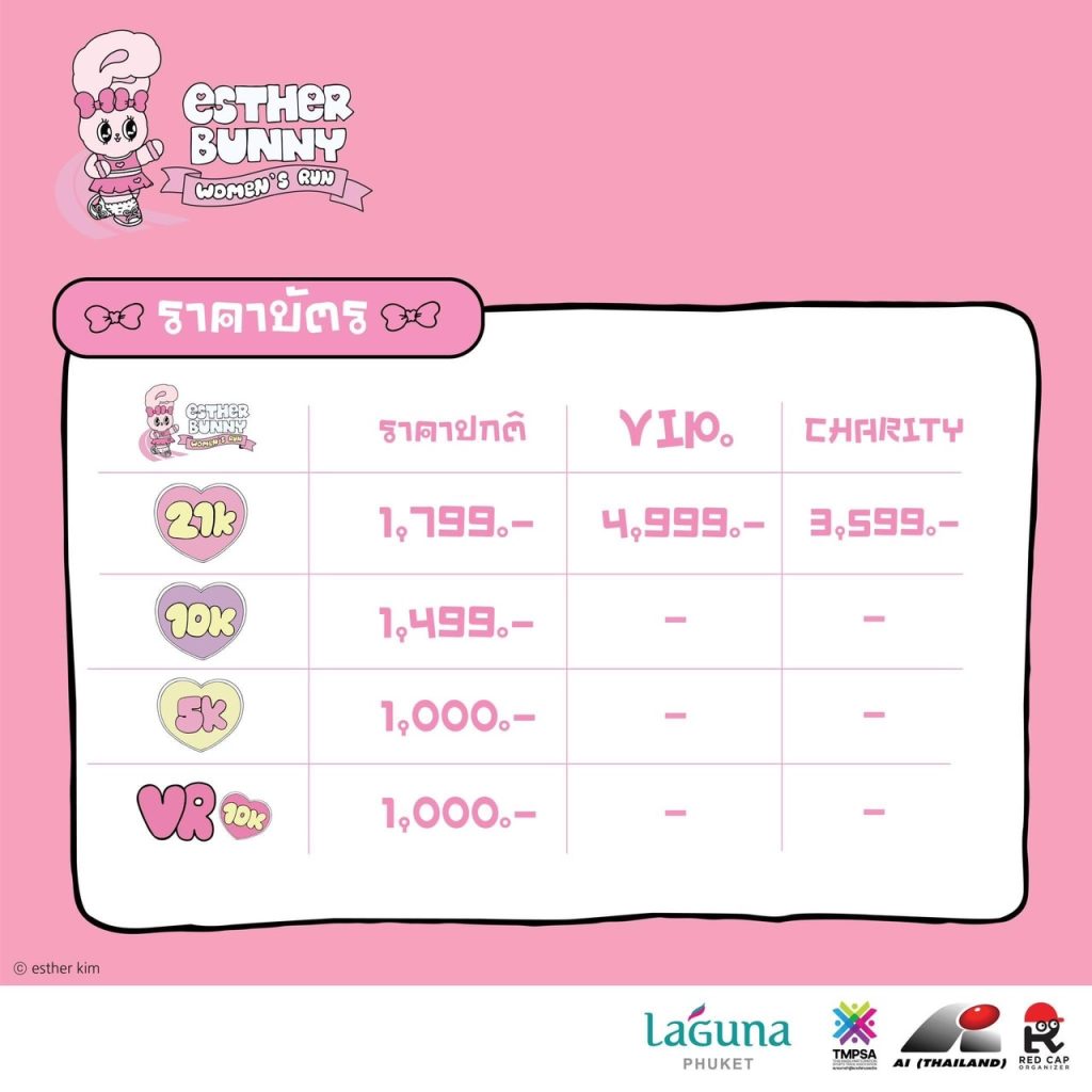 สมัครได้ที่ : www.estherbunnywomenrun.com หรือ http://race.thai.run/estherbunnywomenrun หรือ กดติดตามเพจได้ที่ Facebook : esther bunny women’s run / Line : @estherbunnyrun
